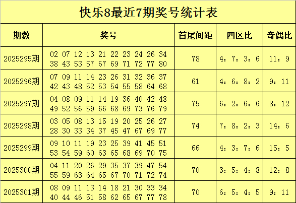 福彩雅瞻念8第2025301期开出奖号:08 09 11 13 14 18 21 30 33 34 40 44 46 51 58 62 65 67 77 78,其中奖奇偶比9:11,四区比为6:5:4:5,跨度为:70。