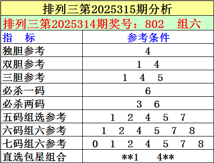 1.陈列三最近十期区别开出号码:497-178-618-234-527-016-114-109-445-802,其中有6期奖号开出了上期的重迭号码,本期防重号轮空,排斥第2025314期奖号:802中的号码,关心号码:4。