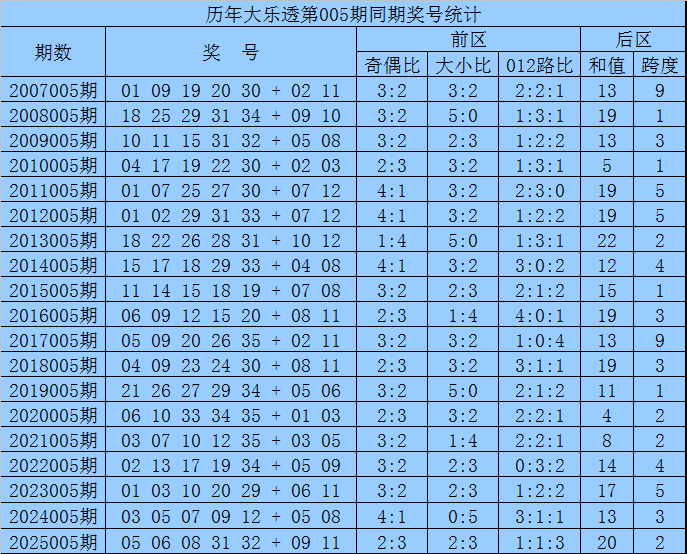 第2026004期大乐透奖号为05 18 23 25 32 + 05 09,其中前区号码奇偶比为3:2,大小比为4:1,012路比为1:1:3,后区号码和值为14,跨度为4。