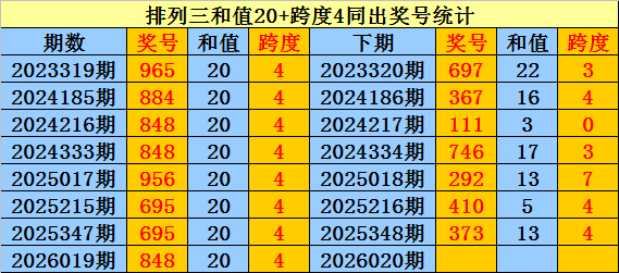 上期回来:成列三第2026019期奖号:848。和值20,跨度4。