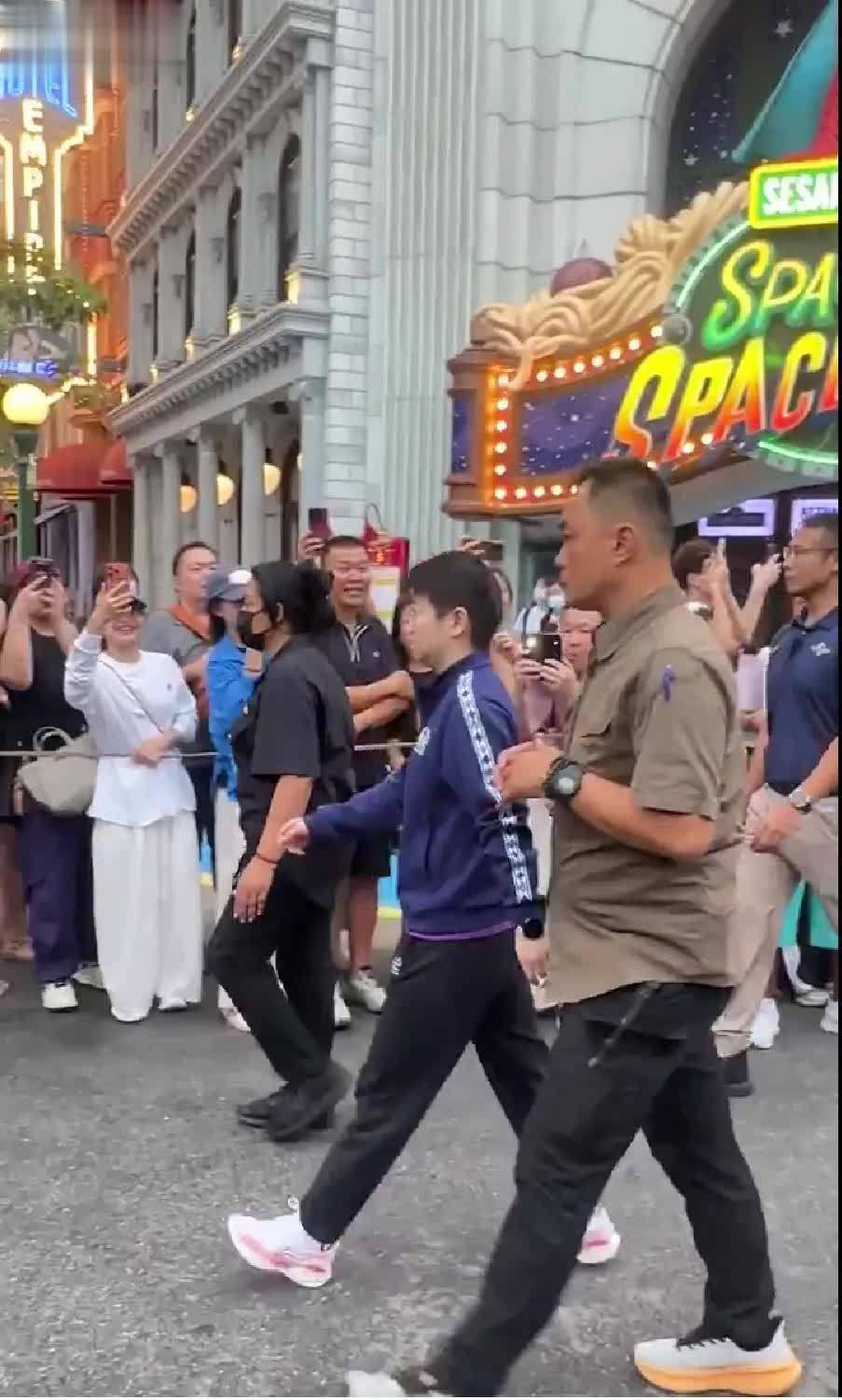 王楚钦走在队伍的靠前位置,他一出场,立即引来了球迷们的激烈欢跃。两位保镖走在王楚钦的两侧,为他和球迷之间筑起一谈防地。